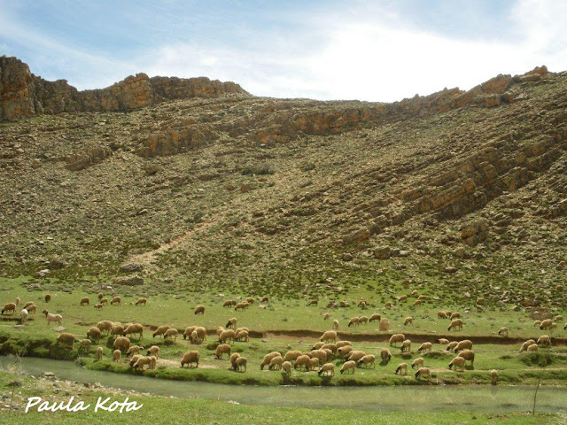 A paisagem é linda. As chuvas das semanas anteriores deixaram tudo verde. Campos sem fim, muitas ovelhas. Os pastores sentam-se à beira da estrada a ver passar os carros. E as ovelhas também. Vou com cuidado sempre à espera de encontrar um rebanho no meio da estrada. Ainda há uns restos de neve cá em cima. E cedros. Florestas e rebanhos. Tudo verde.