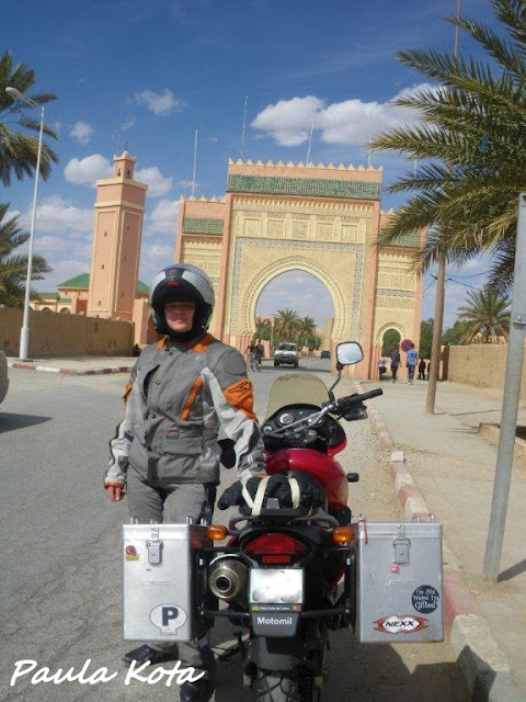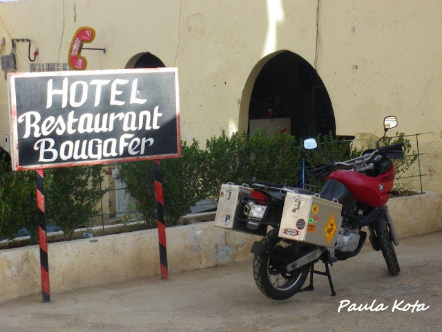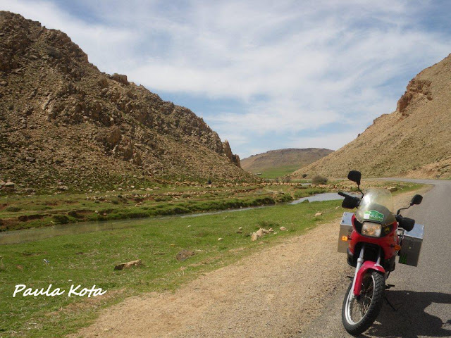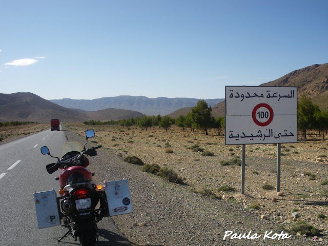 À entrada de Midelt encontro uma barreira policial. Faz sinal para parar. Antes que o polícia me peça os documentos, cumprimento e peço-lhe ajuda. Pergunta-me se estou sozinha. Digo que sim. Faz um ar admirado e olha para trás, para a estrada, à espera de ver mais motos. Nem o deixo respirar. Pergunto se me pode recomendar um Hotel, barato e apropriado para mim. Recomenda-me o Hotel Bougafer e dá-me as indicações para o encontrar. Pergunto se a tempestade vem para cá. Responde que vai chover esta noite de certeza. E que não se consegue passar na montanha, está muito vento, chove bastante e a estrada tem gelo. Ainda são 3h da tarde mas vou ter de ficar por aqui.