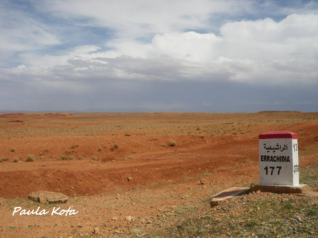 À medida que sigo para sul a vegetação vai escasseando. A terra muda de cor. O verde fica para trás. Primeiro os tons de vermelho, terras de pedras. As placas indicam Er Rachilda a uns 100 km. Já perto de Midelt vêm-se as montanhas ao longe. Cinzentas. Está a chover. E a trovejar. Ao longe vem-se raios enormes e fantásticos. Tinha planeado ficar em Midelt e parece que vou mesmo ficar.