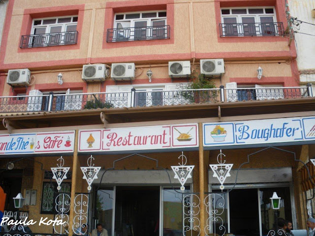 Entro na avenida principal de Erfoud. Muitos restaurantes, alguns grupos de motociclistas a almoçar. Vou andado a ver se algum sítio me agrada. Por experiência, os primeiros restaurantes são os mais caros. É onde os turistas esfomeados param logo. Viro numa outra avenida também cheia de esplanadas. Todos acenam e dizem para me aproximar. Vem um jovem de mobilette perguntar se quero almoçar. Sou teimosa. Vou para onde eu quiser. Vejo um tasco minúsculo com frangos a assar à porta. Ninguém a chamar por mim. Apenas uns locais a beber chá na esplanada. É mesmo aqui. Entro por ali dentro e pergunto se posso comer. Um rapazito novo diz-me que só tem frango. São 45 dirhams e acompanha com batatas fritas e azeitonas. Respondo que não quero batatas fritas (penso cá para mim que o óleo deve ser jurássico) nem azeitonas. Basta o frango e pão. O preço baixa para 30 dirhams. Fixe. Almoço na esplanada sem ser incomodada.