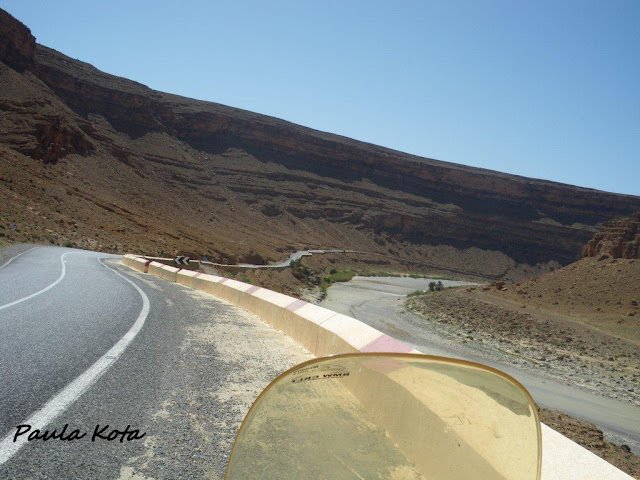 Voltamos para o parque onde está a moto. Diz-me que a estrada até ao outro lado da montanha é muito bonita, mas que devo conduzir com muito cuidado nos próximos 35 km. Estrada apertada com muitas curvas. Depois já posso acelerar. E ri-se muito. Está pedrado de certeza. Não resiste a pedir-me um cadeaux. Qualquer coisa, um souvenir da motard portuguesa. Levo a mão ao bolso onde tenho umas moedas, não mais de 10 dirhams. Digo-lhe que é todo o dinheiro que tenho. E não tens mais nada? No outro bolso tenho um maço a acabar, dois cigarros. Ofereço-lhe. Fica todo contente. Cigarros portugueses. Cheira o pacote e ri-se.