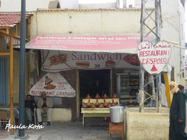 8h da noite. Finalmente um banho quente e saio para jantar. O recepcionista do Hotel indicou-me um restaurante, barato, um pouco mais abaixo, na avenida. Escolho uma Tagine de almôndegas com ovo, apontando para o menu que tinha fotos com preços marcados. Sento-me dentro do restaurante. Arrependo-me logo. Cheira a fritos. A Tagine parece imensa. Penso que só vou comer metade. Acabo com ela toda. Percebo que estava esfomeada. Não almocei, é normal. Peço um chá e vou para a esplanada. O empregado, um miúdo com os seus 16 anos, corre para uma loja perto para buscar o chá. Já tinha feito o mesmo quando pedi uma garrafa de água (jantar 52 dirhams).
