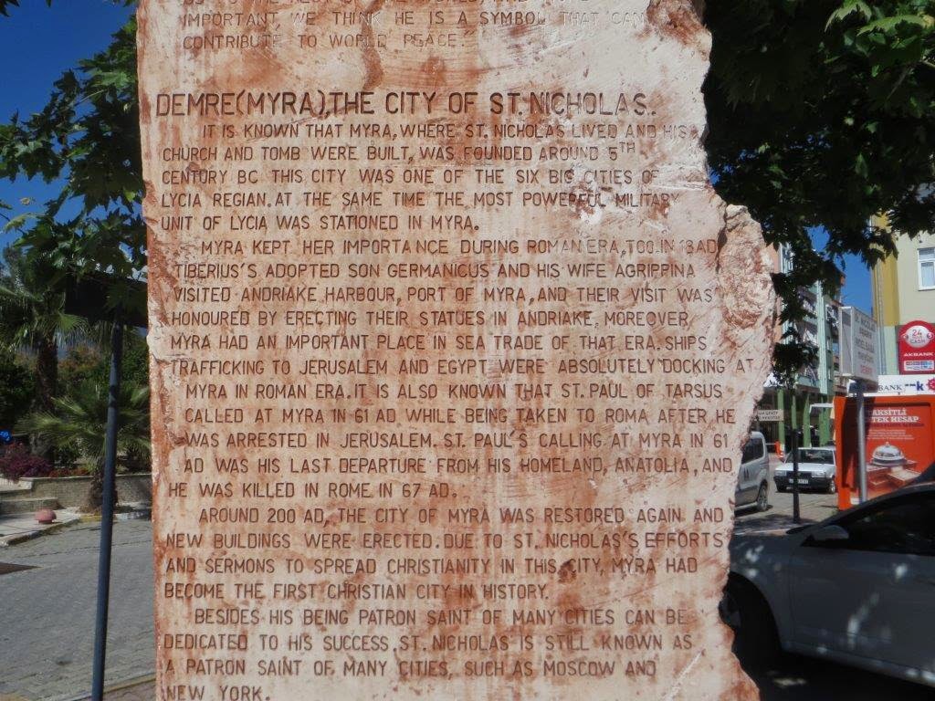 A 1ª etapa é curta. 200 Km até Kas, uma estrada sempre junto à costa, ora sobe os montes, ora segue rente ao mar. Paro numa pequena cidade onde viveu São Nicolau, o bispo de Demre, cujo sarcófago está numa igreja construída em sua honra. Segundo reza a lenda, S. Nicolau foi famoso pelos seus milagres e generosidade. Os seus restos mortais foram levados por mercadores para Itália e a sua santidade deu origem a que se tornasse padroeiro da Grécia e da Rússia. O culto do padroeiro S. Nicolau deu origem à personagem do Pai Natal que conhecemos hoje. No centro da cidade há uma estátua com uma lápide explicativa.