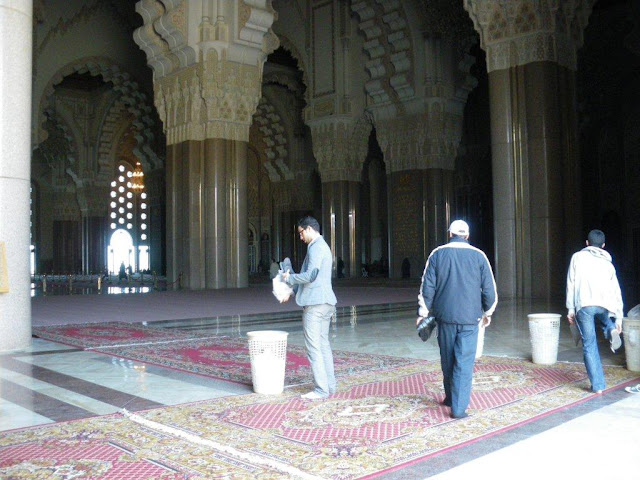 Passamos a tarde na Mesquita Hassan II. Construída nos anos 90, é um edifício de pedra branca, imponente, que domina a baía de Casablanca. Arcadas gigantescas, interior ricamente trabalhado, um espaço enorme onde cabem 25.000 fiéis.