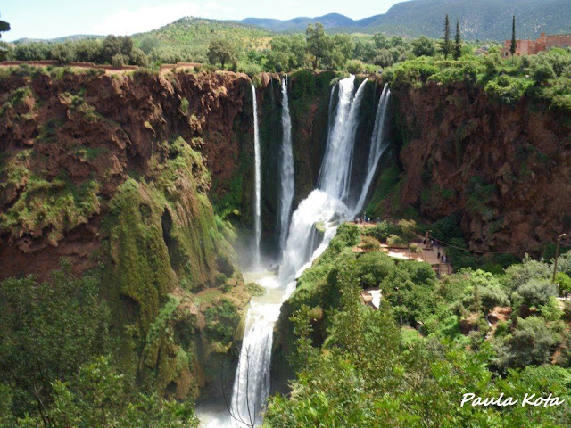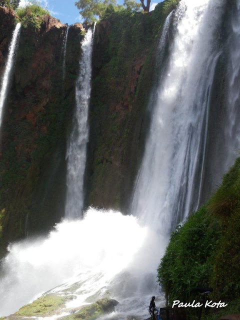 Chego às cascatas perto da hora de almoço. No largo há uma patrulha de polícia. Pergunto onde posso estacionar. Indicam um parque do lado esquerdo. Na entrada está um velhote a chamar para estacionar. Pergunto o preço. São 5 dirhams. 5 Dirhams? O dia todo, responde ele. Não consigo esconder o riso. Corre à minha frente para dizer onde estacionar. Ainda não tirei o capacete já está a oferecer-se para me mostrar as cascatas. Não tenho dinheiro, respondi. Olha-me surpreendido, não sei se por ser mulher se por dizer que estou falida. Coça a cabeça e ri-se. Mostro-te as cascatas de borla. E ri-se. Vou atrás dele.