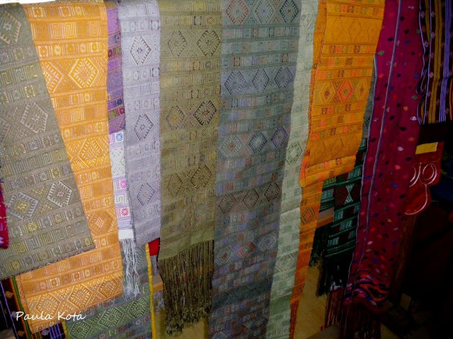 Numa das aldeias há uma loja de artesanato que vende produtos de tecelagem. Cá fora está um tear manual. Tapetes, mantas ou faixas de cores garridas, umas em lã, outras em fio de seda. Todas incríveis, com motivos espirituais, parecidos com os padrões que vi nos mosteiros. Feitas à mão por artesãos. Caras, caríssimas. A loja até tem um terminal de pagamento automático. Enquanto os alemães fazem compras entretenho-me a fotografar o interior da loja. Para além dos tecidos, há máscaras espectaculares.