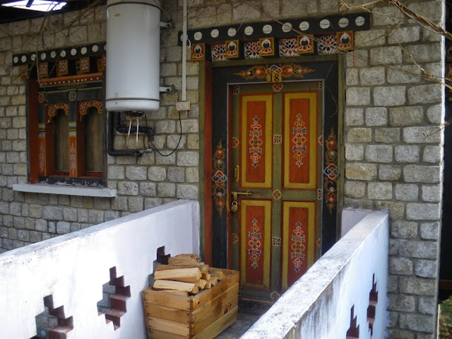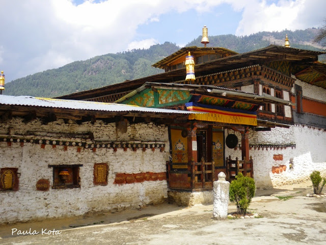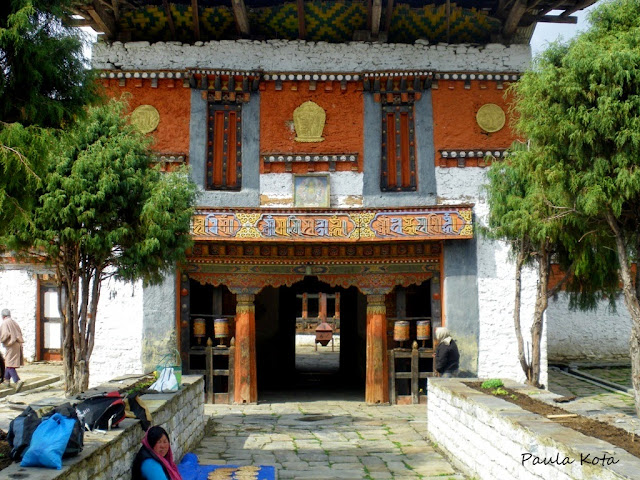 Uns poucos km mais à frente e estamos no Kurje Lhakhang, um conjunto de 3 mosteiros. O muro que rodeia o complexo tem 108 pequenos chortens (de novo o número 108). Entra-se por um arco em madeira para um enorme pátio. Só um se pode visitar um dos mosteiros mas é o mais sagrado. Foi construído na entrada de uma gruta onde Padsambhava - o Guru Rimpoche, meditou. Tal era o seu poder que deixou gravado na rocha a marca do seu corpo enquanto meditava. É considerado um local santo. Não deixam tirar fotos no interior.