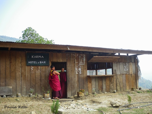 O nevoeiro ficou lá em cima, a estrada de terra também. Rolamos montanha abaixo, embalados pelas curvas que contornam a encosta. Numa paragem para descansar há um pequeno café pendurado na encosta. Tem um nome interessante. Lá dentro estão 4 monges a comer. Também devem andar em viagem para um qualquer mosteiro. Olham-nos com curiosidade.