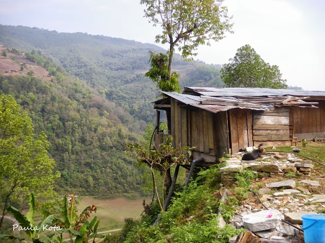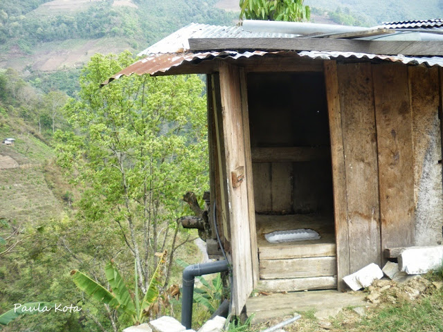 Por aqui não existe o conceito de casa de banho. As populações utilizam o campo. Cada vez que preciso tenho de ir atrás de um arbusto. Hilariante. Também é raro haver um local com uma mera latrina. Aqui há. Mas foi uma experiência assustadora. Um cubículo em madeira pendurado no abismo. No chão há espaços entre as madeiras a olhar para o vazio lá em baixo. Foi preciso um auto controlo muito forte para conseguir fazer as necessidades. Não vai ser difícil contar piadas sobre esta odisseia.