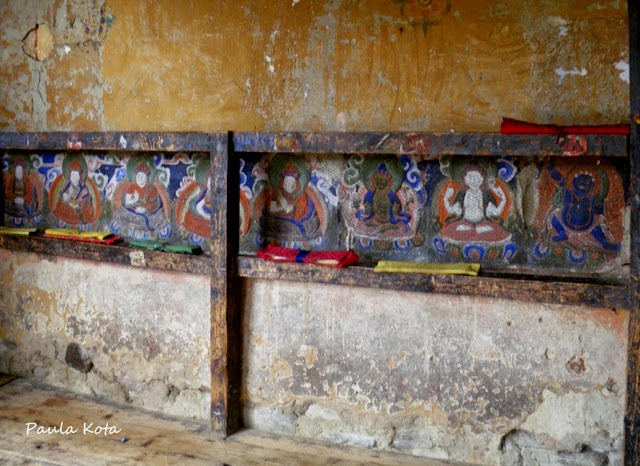 Mais uma estrada que não existe, um caminho de terra e poças de água para chegar a outro mosteiro - Tamshing Lhakhang. Este também é muito antigo e foi construído por um monge que se dizia ser a reencarnação do Guru. Tem umas pinturas espantosas mas em muito mau estado. No corredor interior estão pintados mil Budas. O templo está quase em ruínas e é mantido pelos aldeões.
