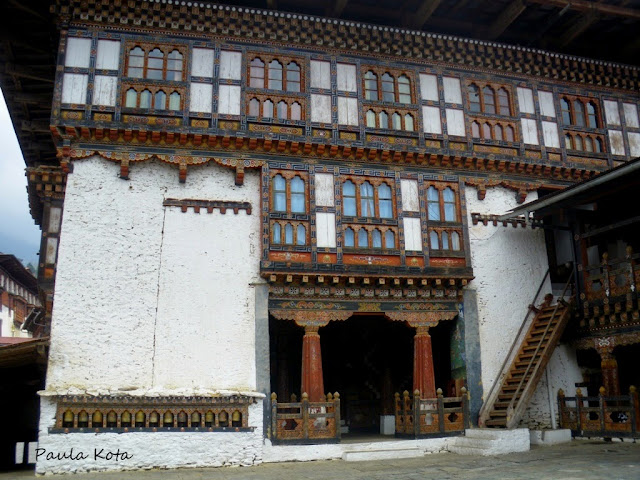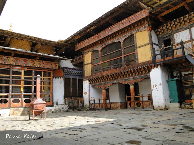 Apenas é permitido visitar o pátio interior da fortaleza – Trongsa Dzong. Entramos por uma pequena ponte de madeira, subimos a estrada de acesso e uma porta estreita leva-nos por um corredor cheio de pinturas de Buda ao pátio interior. Não me canso de ver esta arquitectura cuidada, os pormenores do trabalho em madeira, as pinturas de cores fortes.