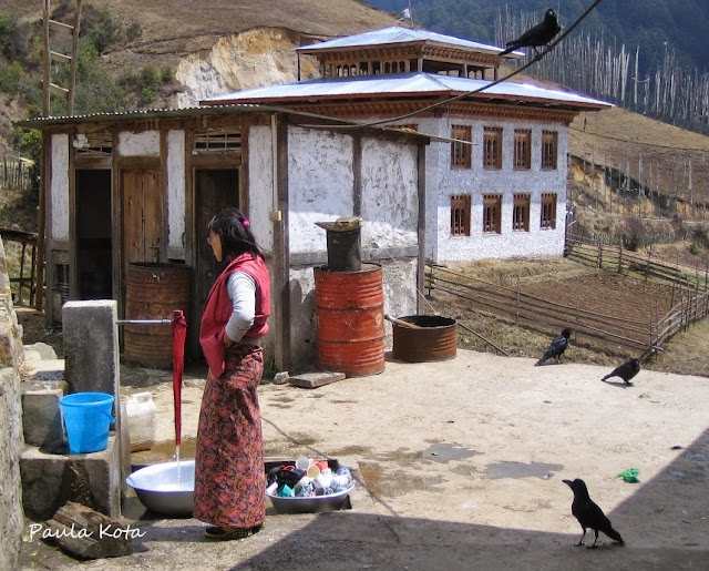 Muitas crianças correm para nos ver. Curiosas, riem-se para nós. Reparei no caminho muitos grupos de crianças, com lancheiras, a caminhar à beira da estrada, saídas da escola de certeza. O Tenzin diz que esta região do país tem uma taxa de nascimento muito elevada. Até há poucos anos os jovens casavam muito cedo. As raparigas aos 12 anos e os rapazes aos 14 anos. Por tradição os casamentos são combinados pelos pais que escolhem famílias do mesmo estatuto social ou melhor. Agora é proibido. Só podem casar a partir dos 18 anos. E se dois jovens se quiserem casar podem pedir autorização ao tribunal. Mas é raro acontecer porque os filhos respeitam muito a opinião dos pais. O divórcio é permitido e a taxa de divórcios é muito alta. Ele próprio já vai no segundo divórcio. Casamentos arranjados pelos pais. Depois da explicação remata com uma frase que me arrepiou – Sabes, o conceito de amor e estar apaixonado é muito recente no Butão. Fiquei sem palavras. Acho que vou demorar a mastigar isto.