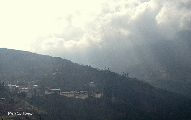 Mais um despertar de madrugada. A vista do hotel é mais uma vez fabulosa. Montanhas e florestas cobertas por nevoeiro. Pedaços de nuvens estão presos nas árvores. Ando a tirar umas fotos do hotel porque ontem chegámos já não havia muita luz. Nem me apercebi da vista fantástica sobre a fortaleza de Trongsa.